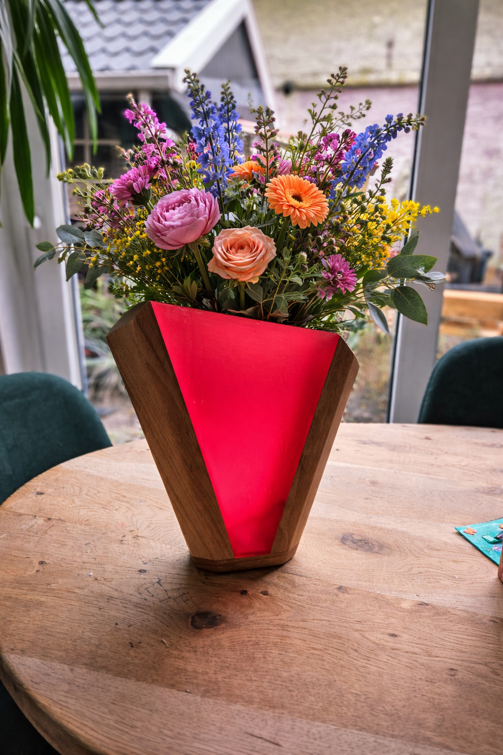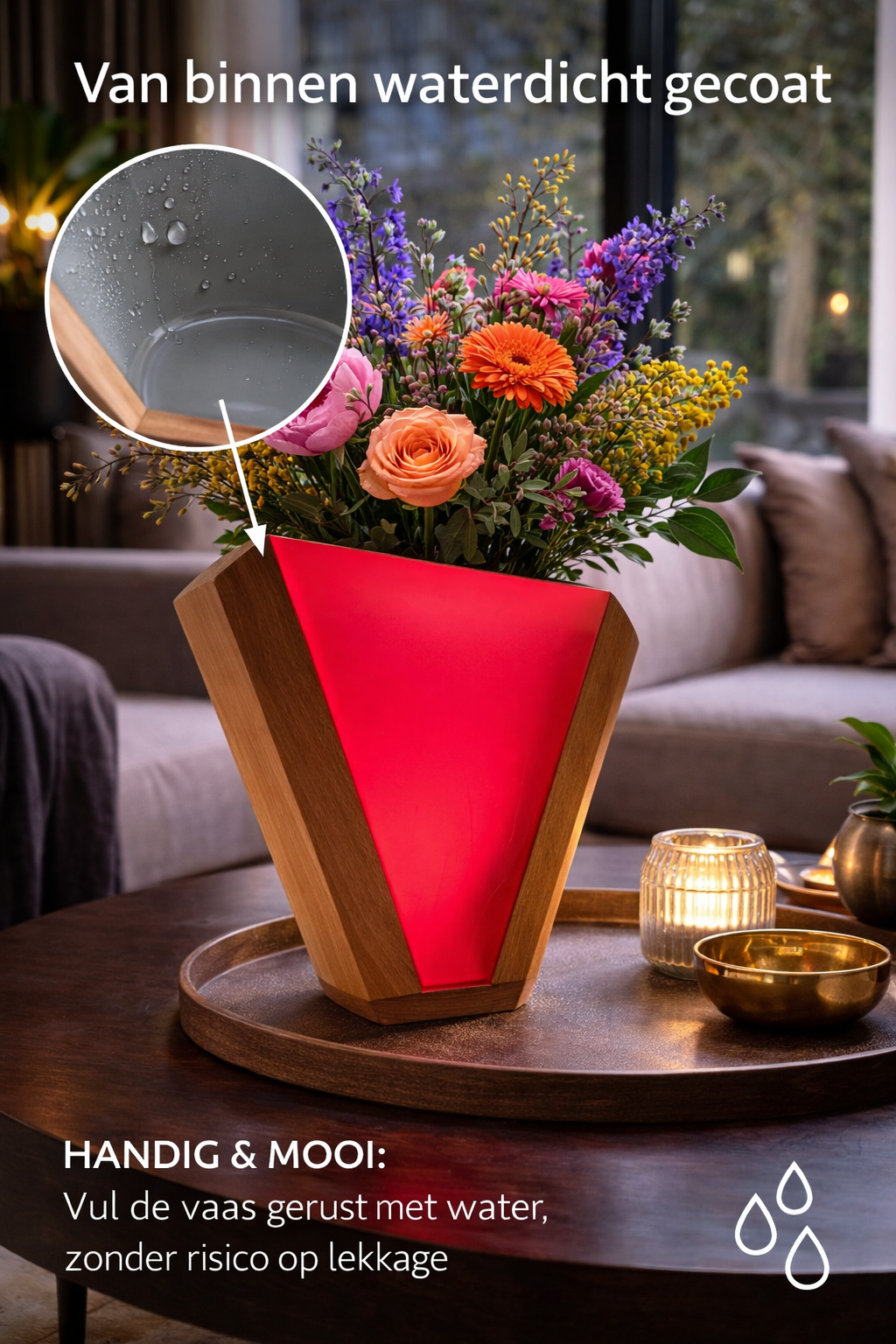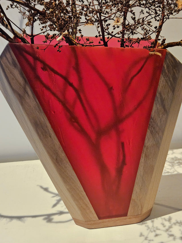 Het massieve hout wordt gecombineerd met een diepe, rode epoxy die volledig waterdicht is afgewerkt. Hierdoor is de vaas geschikt voor verse snijbloemen, maar ook perfect als decoratief object met droogbloemen of takken.