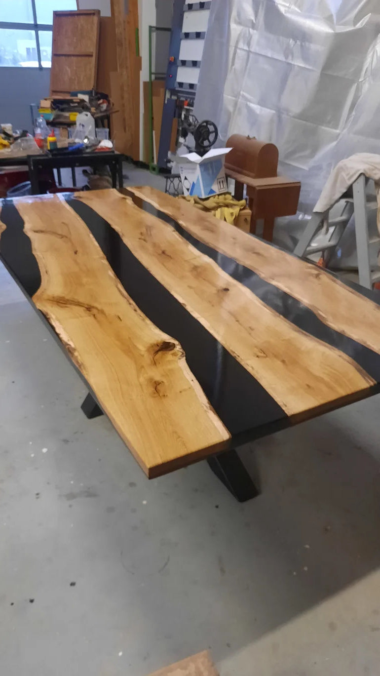 Een tijdloze eettafel van 250 x 120 cm, vervaardigd uit eikenhout uit de tuin van de klant. De combinatie met zwarte epoxy en een matte afwerking zorgt voor een stijlvol en persoonlijk meubelstuk met karakter.