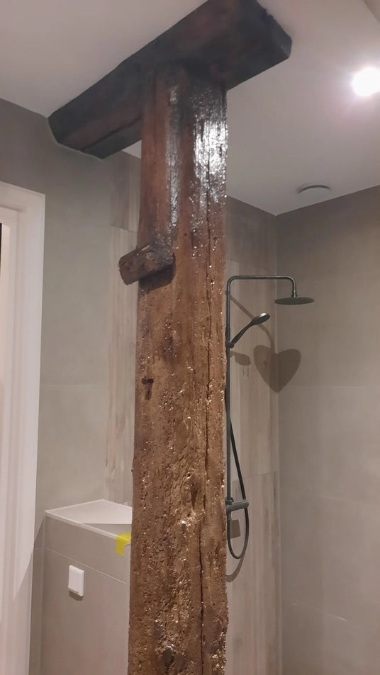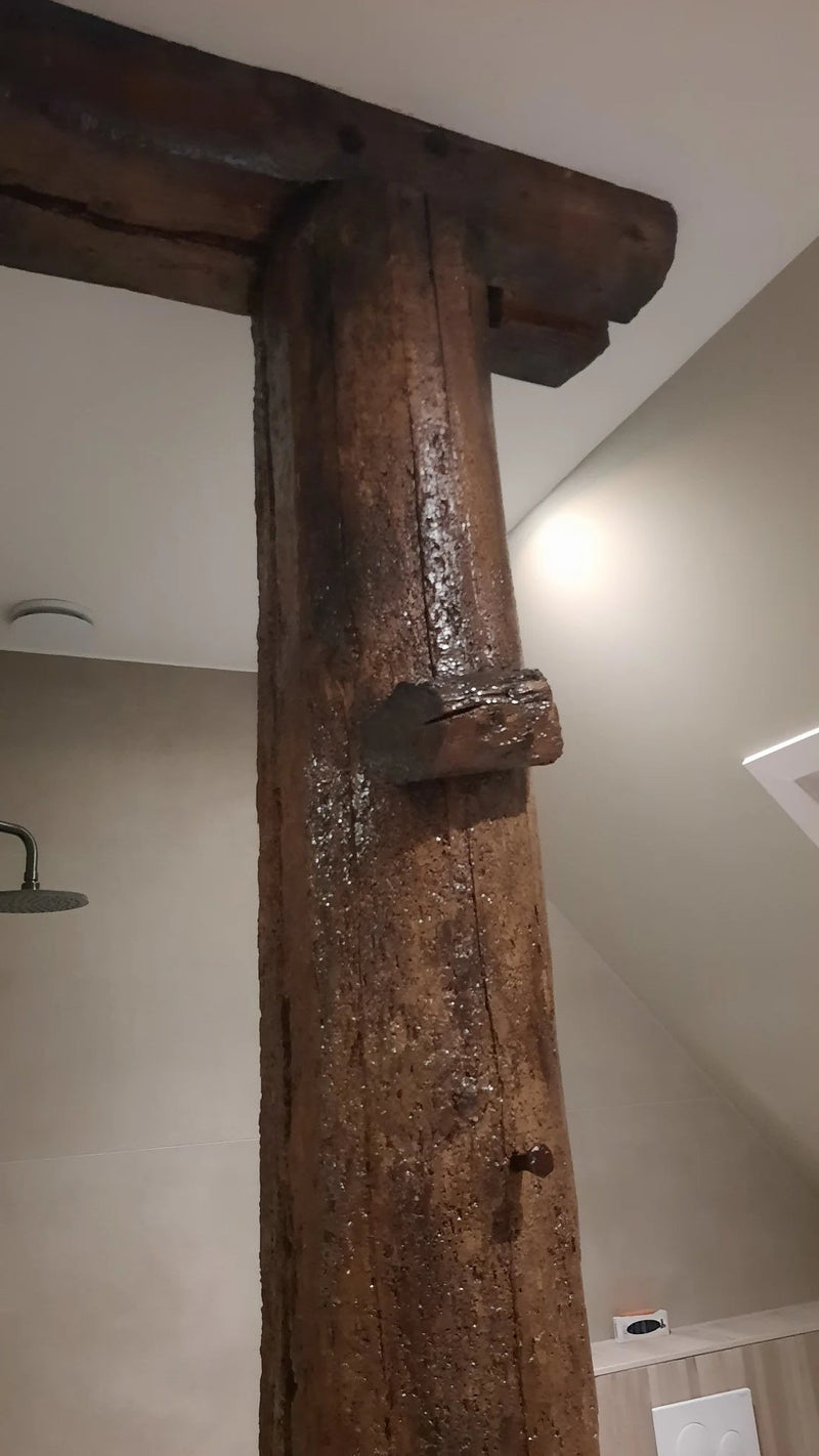 Bij deze bijzondere klus hebben we een oud houten spant dat dwars door de badkamer liep, vakkundig geseald en beschermd tegen water. Zo blijft het karakter behouden zonder in te leveren op functionaliteit.