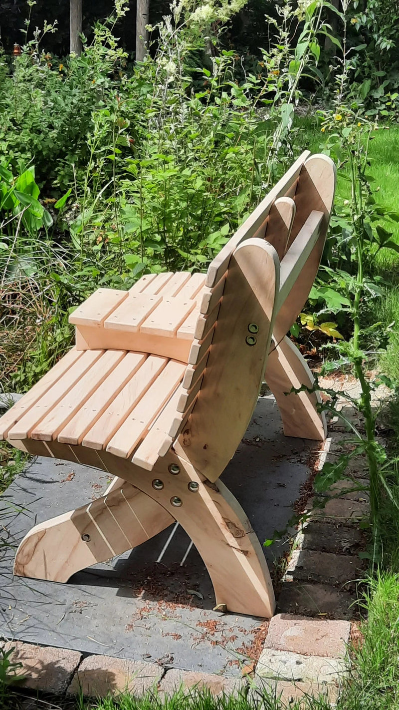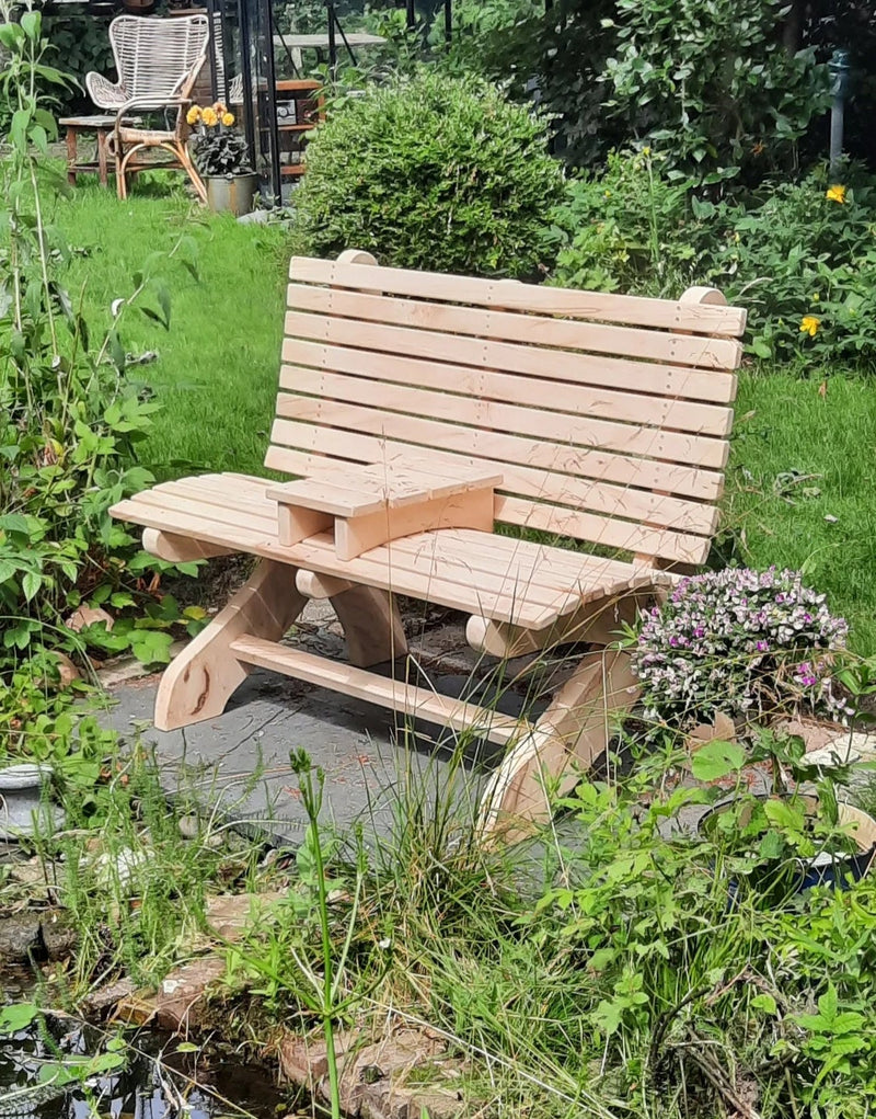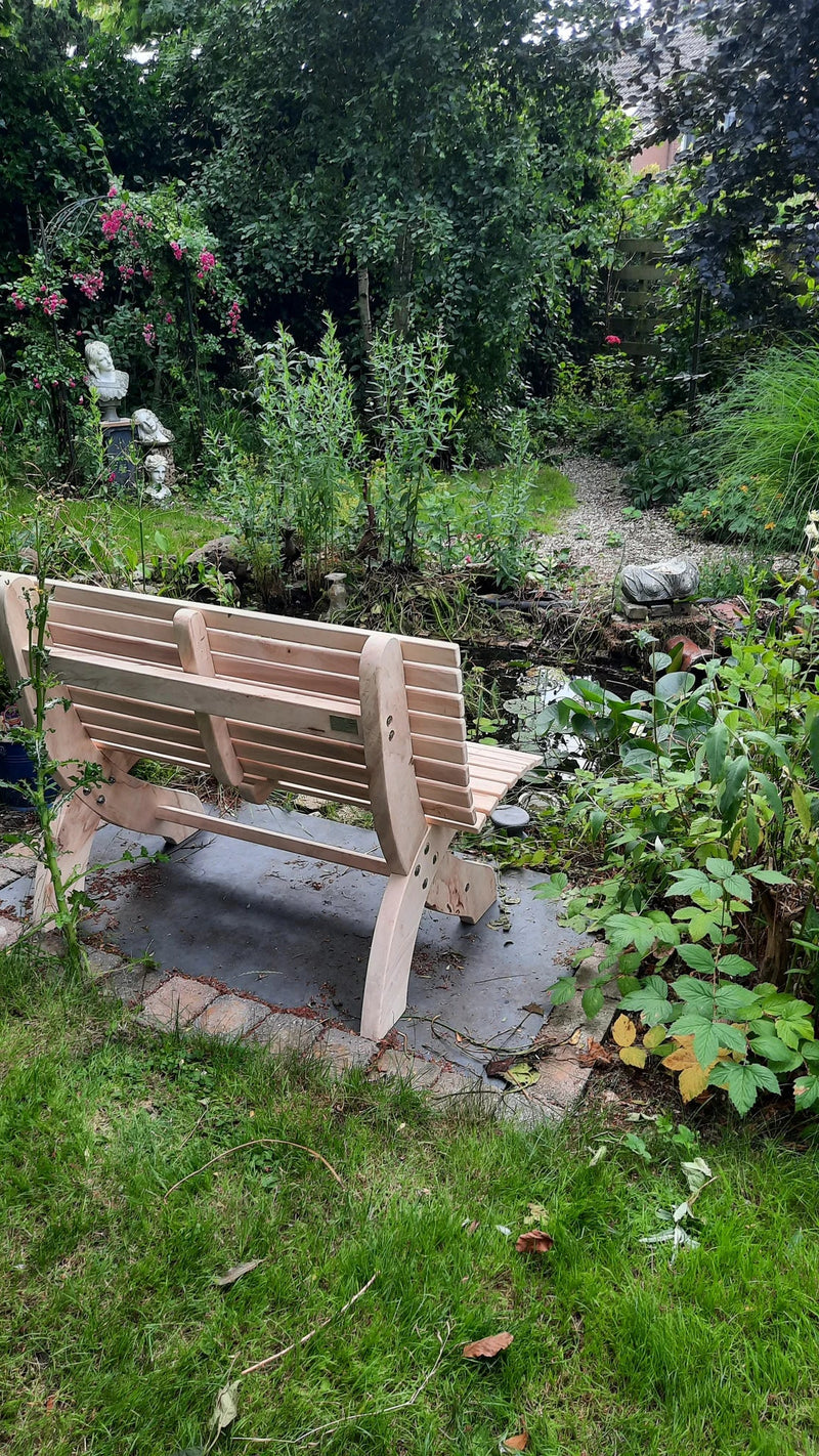 Voor een particuliere opdrachtgever maakten we dit robuuste bankje van kastanjehout. Het hout sluit perfect aan bij de natuurlijke omgeving rondom de vijver.