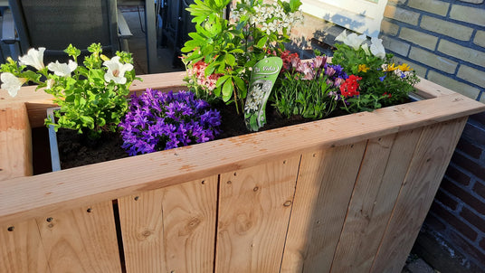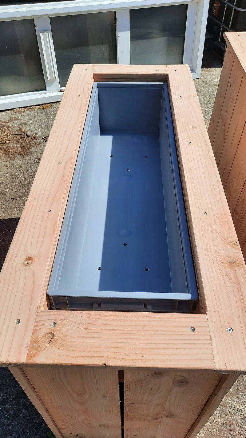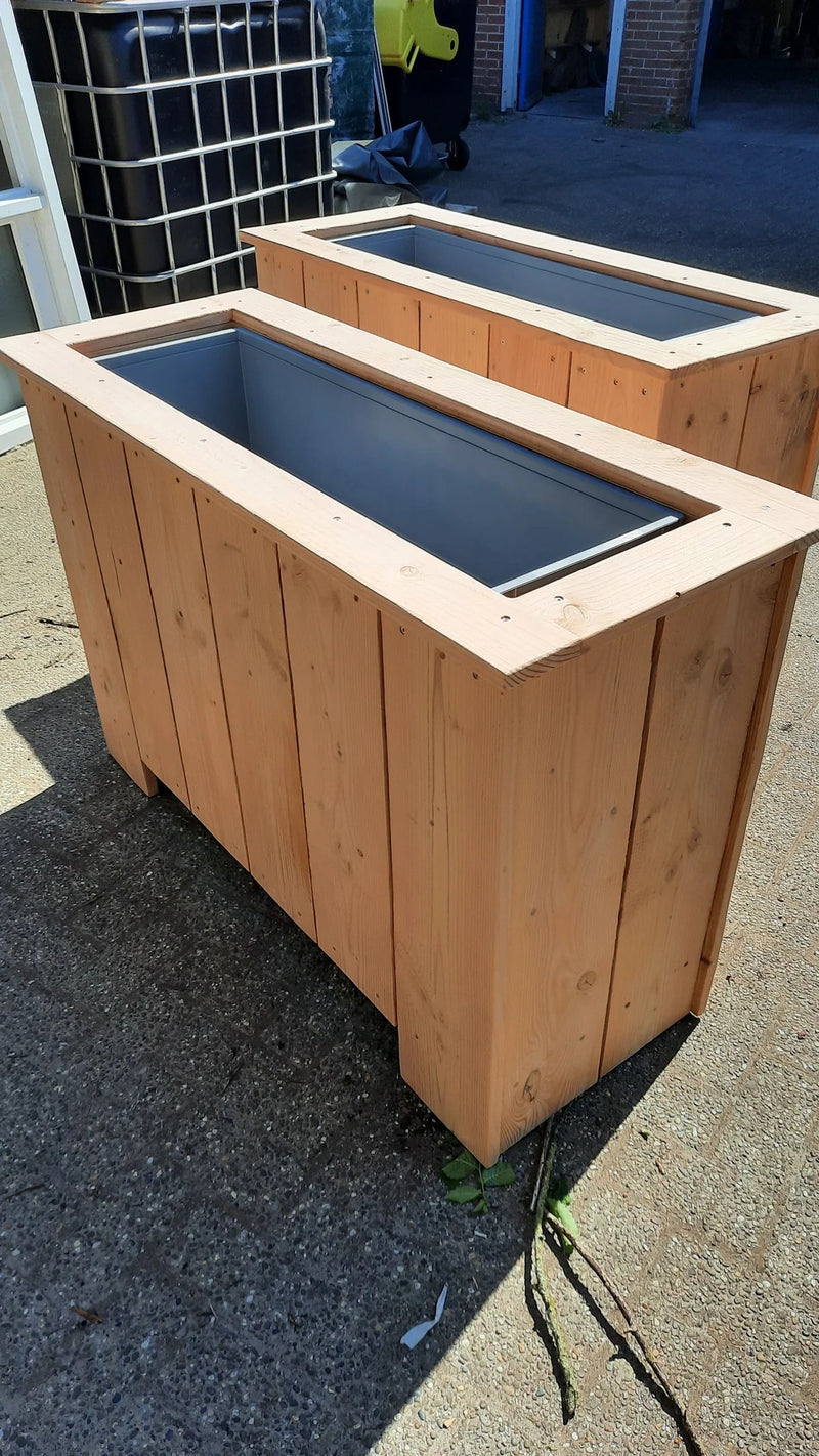 Twee grote bloembakken van duurzaam douglashout, voorzien van kunststof inzetbakken. Een mooie combinatie van stevig vakwerk en praktisch gebruiksgemak.