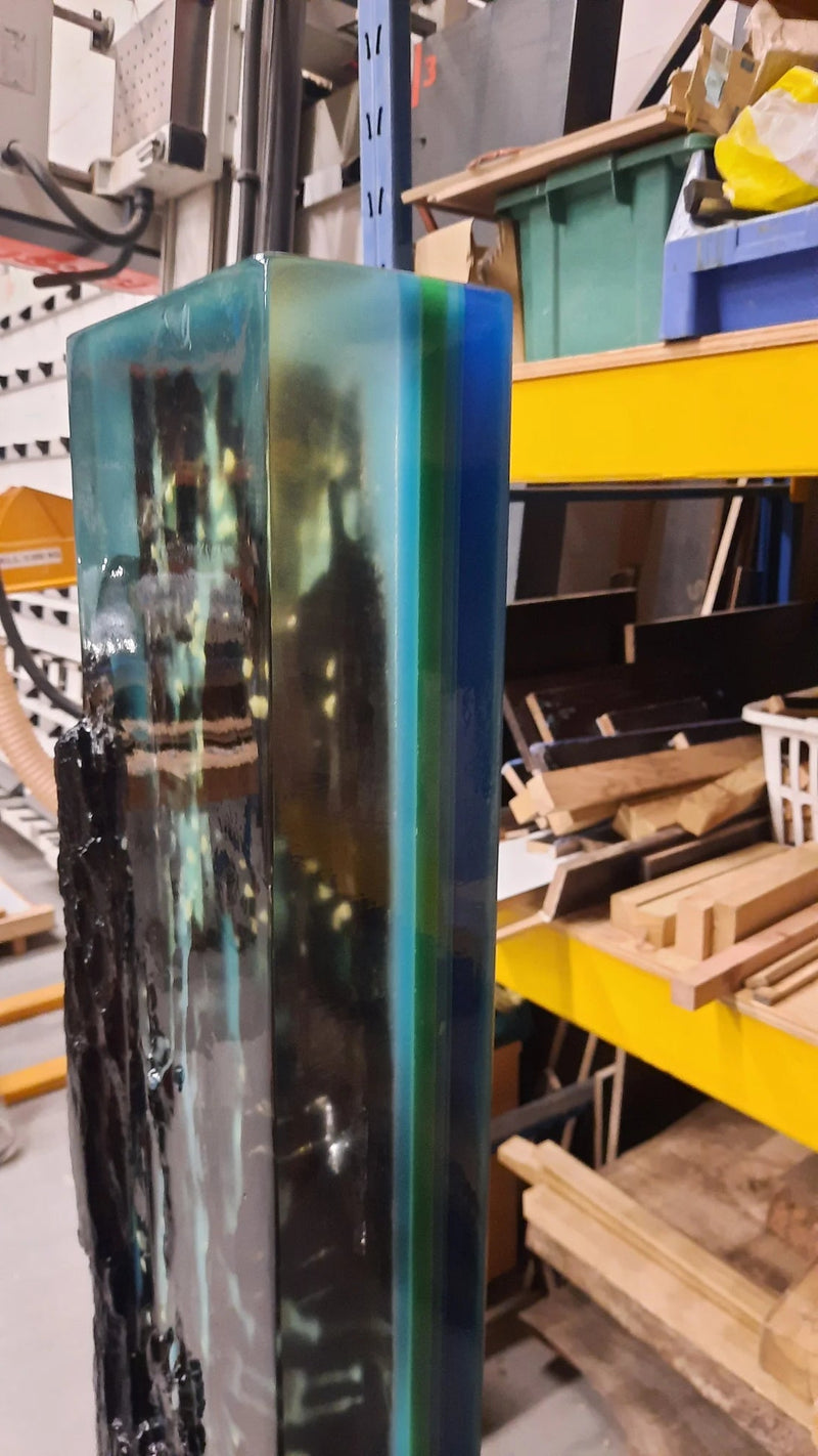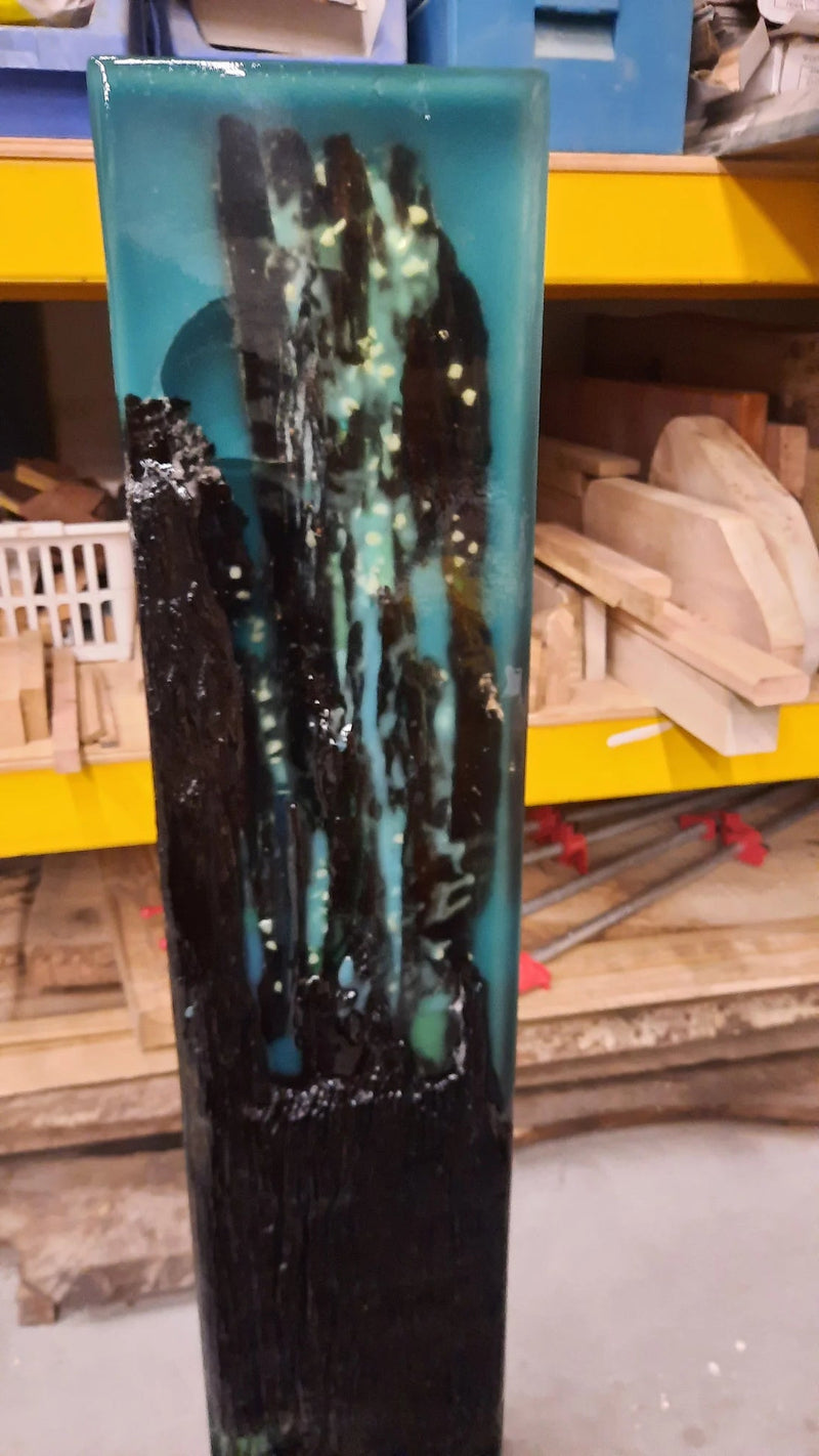 Van een zware, gebruikte havenpaal maakten we een uniek tuinobject. De blauwe en groene glow in the dark epoxy zorgen voor een subtiele, sfeervolle gloed in het donker.