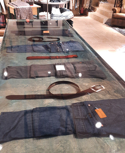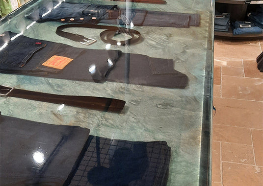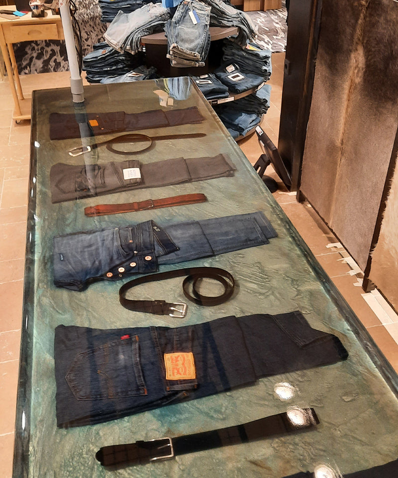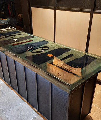 Voor Mantje Store in Den Burg realiseerden we een unieke kassabalie voor de spijkerbroeken-afdeling. De balie van 250x80x10 cm is afgewerkt met een epoxy onderlaag in aansluitende kleuren en een transparante toplaag waarin echte spijkerbroeken en riemen zijn verwerkt. Een opvallende eyecatcher in de winkel.