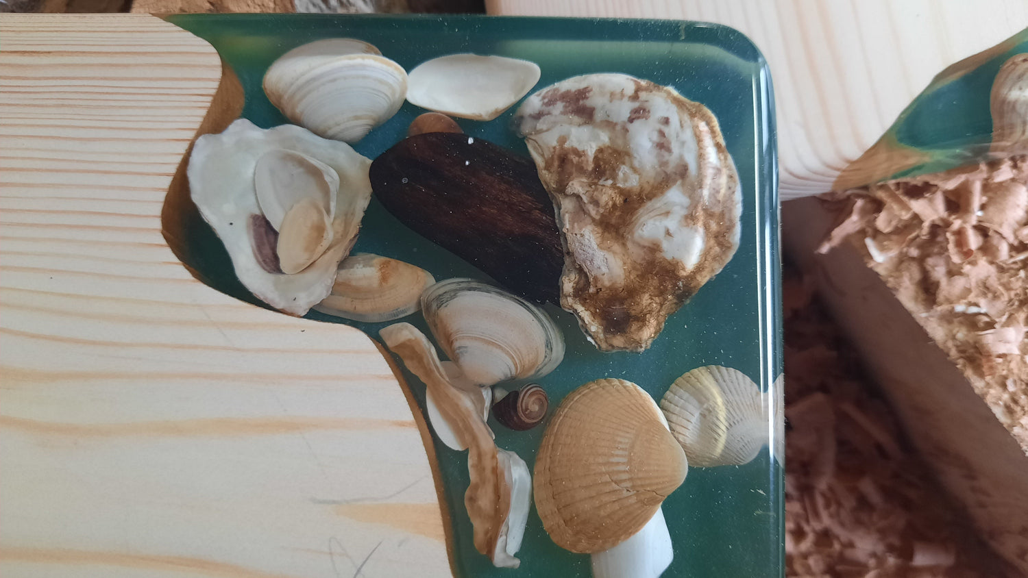 Grene hout serveerplank DE JUTTER 1 – Epoxy & Schelpen | 50×19×2,5 cm