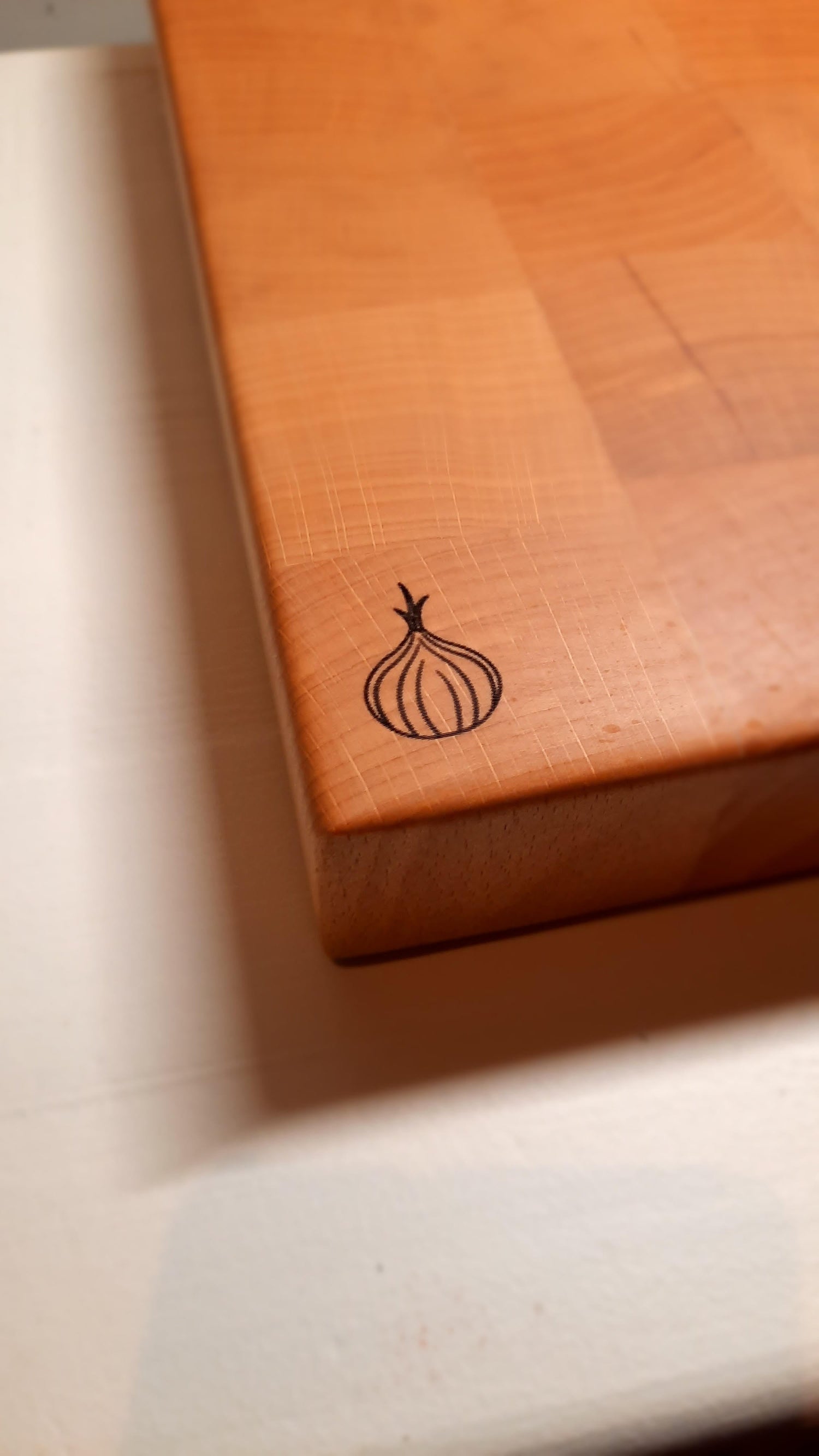 In de hoek van één zijde prijkt een kleine gelaserde ui — een knipoog naar de pure smaken van de keuken. Deze zijde is bedoeld voor aromatische ingrediënten zoals ui en knoflook. Een klein teken van aandacht dat past bij het ambacht waarmee de plank is gemaakt: zorgvuldig afgewerkt, met liefde voor materiaal en gebruik.