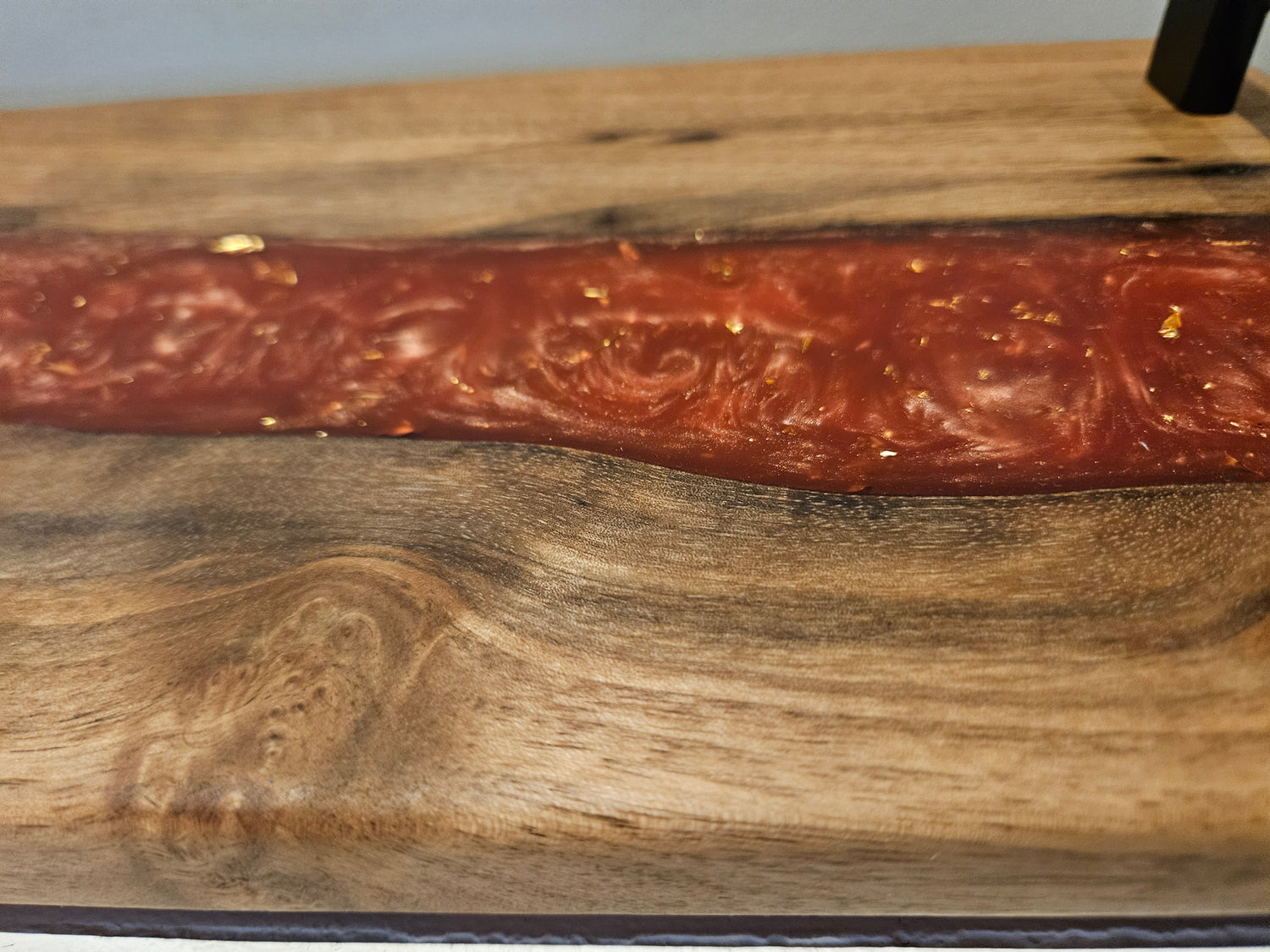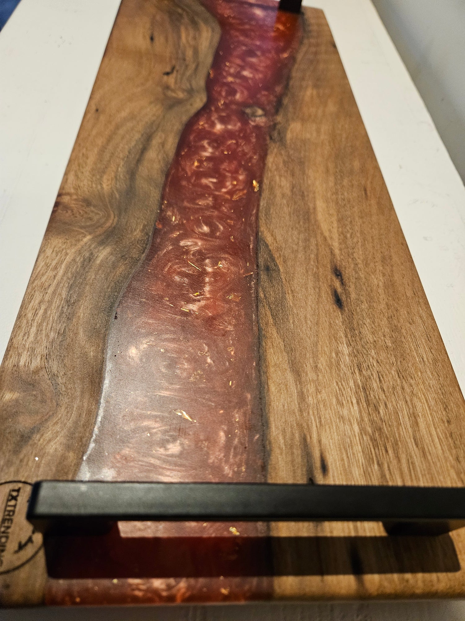 Het natuurlijke hout wordt versterkt door een handgegoten epoxy baan, wat zorgt voor een luxe en unieke uitstraling.